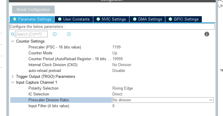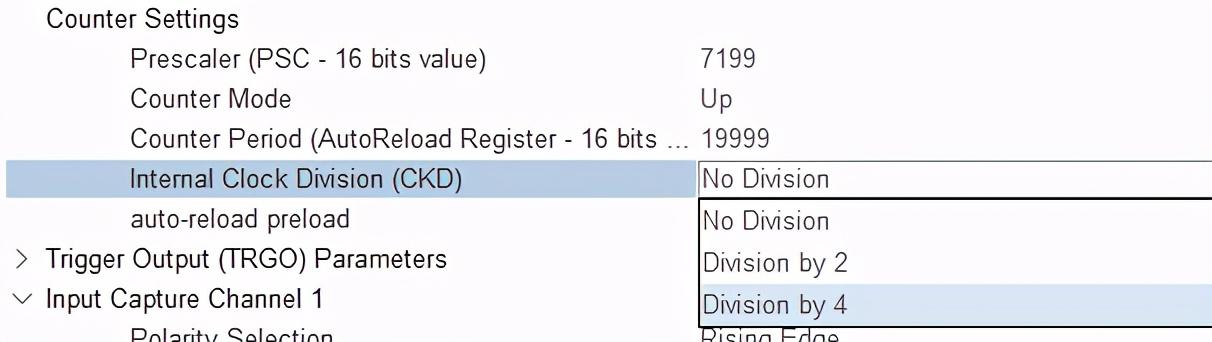 设定定时器的时基,此时基中的CNT寄存器的计数值将传递给CCR寄存器,是输入捕获的时间基准;设定输入捕获的捕获模式,上升沿捕获、下降沿捕获,若设定上升沿捕获,则捕获上升沿;若下降沿捕获,则捕获下降沿;捕获模式配置