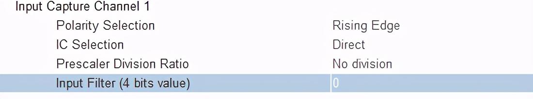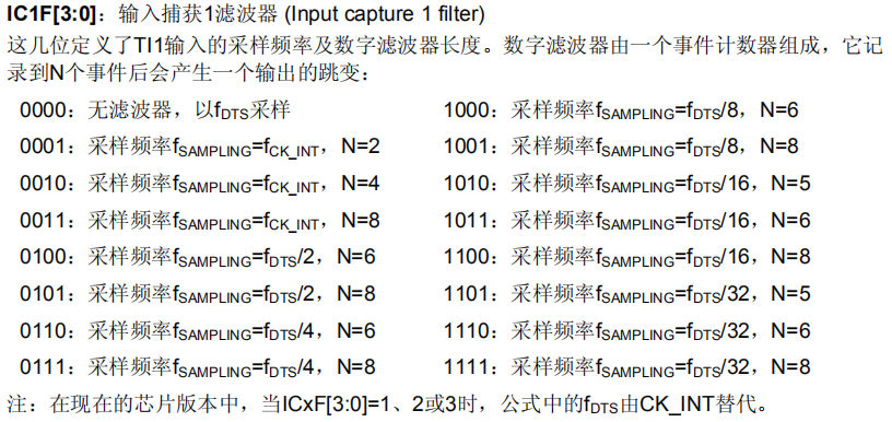 设定捕获的输入滤波参数。滤波参数为二进制4位,具体功能可依据下图中的数字具体值来进行配置。滤波器设定1