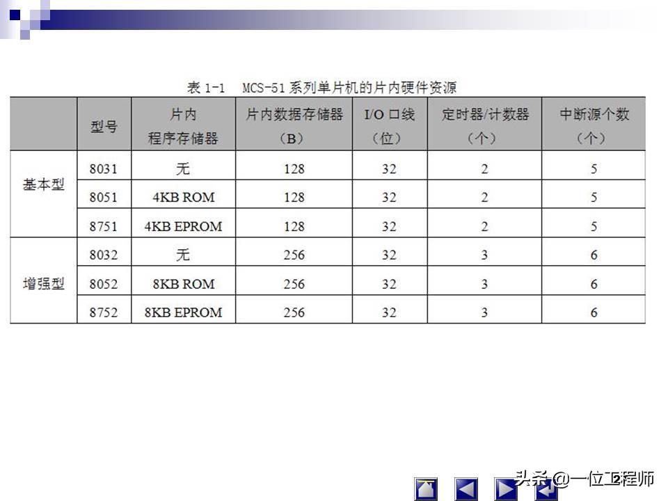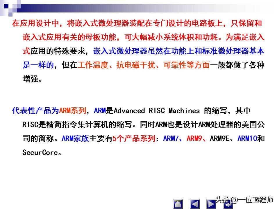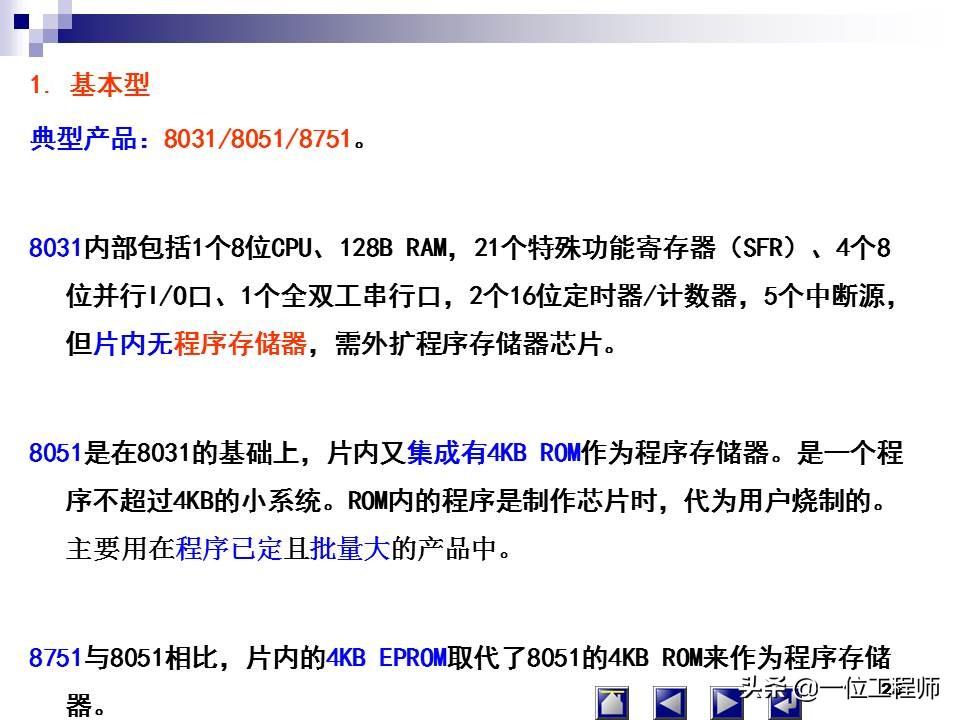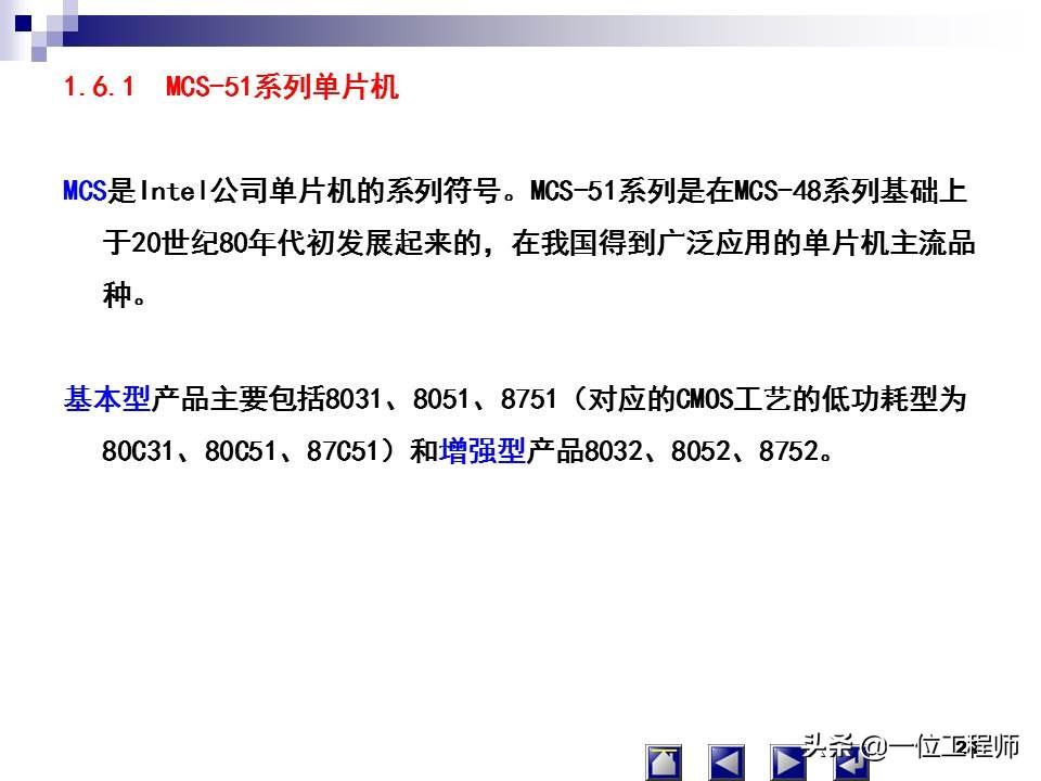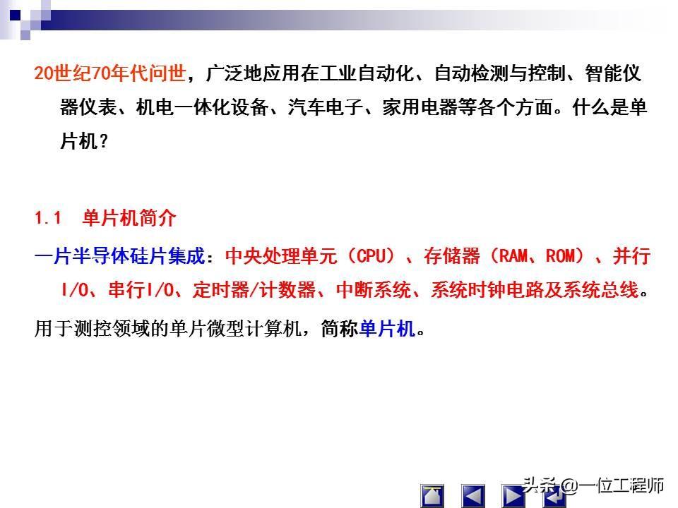 一片半导体硅片集成:中央处理单元(CPU)、存储器(RAM、ROM)、并行I/O、串行I/O、定时器/计数器、中断系统、系统时钟电路及系统总线。用于测控领域的单片微型计算机,简称单片机。