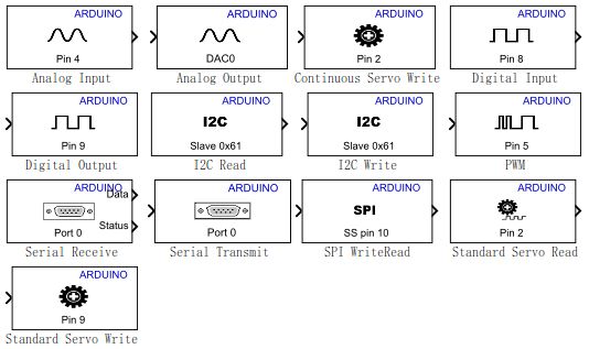 使用Arduino在simulink中搭建的LED闪烁的一个例子,相比之前C语言代码实现的方式,这里没有写一行代码就实现了LED闪烁。读者有没有感觉这种开发方式即简单又方便,要实现什么功能就直奔主题,不用一行一行的敲代码、排查代码错误。图1只是arduino其中的I/O输出外设,在图2中还有其它很多外设可以使用,再结合matlab强大的功能,读者可以实现很多实际应用。