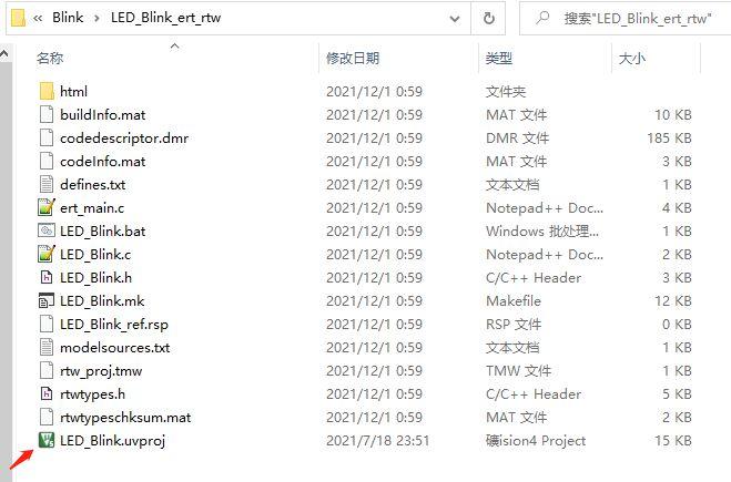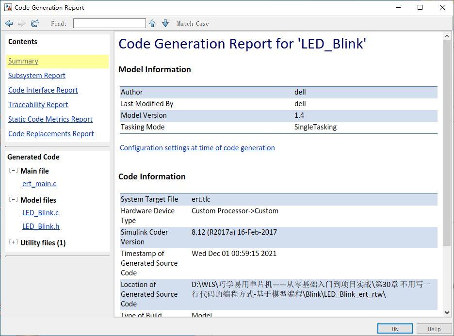 代码生成根据电脑性能不同,需要的时间也不一样,稍等一会儿,弹出“Code Generation Report”窗口报告,如图11所示,在这个窗口中可以看到整个模型生成了三个文件,分别是“ert_main.c”、"LED_Blink.c"和"LED_Blink.h",然后在LED_Blink.slx文件所在的目录下多了一个“LED_Blink_ert_rtw”名字的文件夹,生成的三个文件也包含在当中;看这三个代码有点像之前讲的模块化编程方式命名。