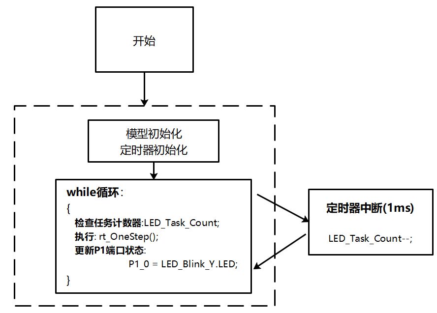 int_T main(){ /* Initialize model */ LED_Blink_initialize(); /* 定时器0 初始化 */ SYSTEM_T0_Init(); /* 使能总中断,这样定时器0才会启动 */ EA = 1; /* Attach rt_OneStep to a timer or interrupt service routine with * period 0.2 seconds (the model's base sample time) here. The * call syntax for rt_OneStep is * * rt_OneStep(); */ while (rtmGetErrorStatus(LED_Blink_M) == (NULL)) { /* Perform other application tasks here */if(LED_Task_Count<=0) { LED_Task_Count = LED_TASK_TIME; rt_OneStep(); /*输入/输出接口放置位置*/ P1_0 = LED_Blink_Y.LED; } } /* Disable rt_OneStep() here */ /* Terminate model */ LED_Blink_terminate(); return 0;}