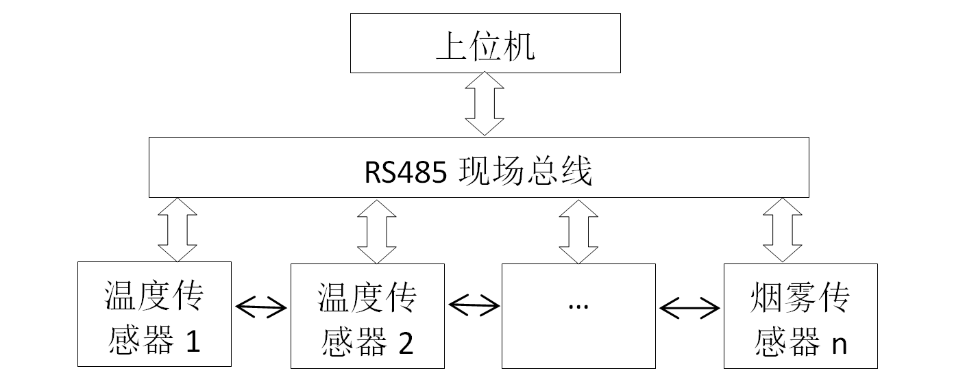 除此之外,为了防止传感器由于电缆接头爆燃或者炸裂过程中受损,导致无法向上位机传输信号,本文设计的是多主机系统,即每一个传感器对应的都是一个主机,主机之间可以相互通信,并且通过RS485现场总线向上位机系统设计方案如图1所示。