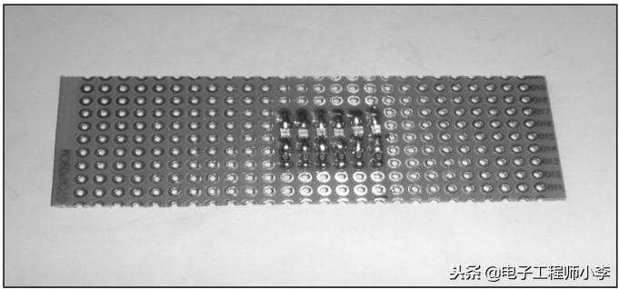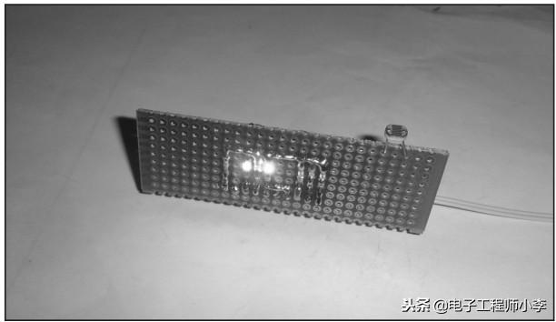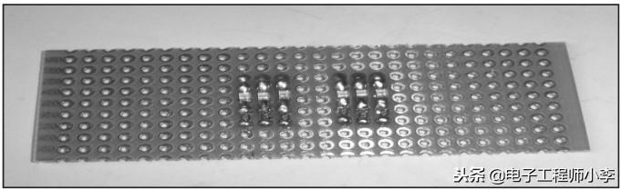 02 然后在其中的一块洞洞板背面分别焊接上贴片LED和470Ω的贴片电阻,此作品要求越小越好,因此元器件都选用了贴片封装以减小体积,LED从左往右的排列为红、绿、蓝、红、绿、蓝(对应单片机的P3.0~P3.5引脚)。为了显示出七彩的效果,一定要按照红、绿、蓝的排列顺序,这三原色能组合出多种不同的颜色。注意要在中间间隔两个焊盘的位置,因为这块板子是放在左边的位置,也就是单片机P3组引脚的一边,为了更好地方便后面的对应焊接,中间跳过晶体振荡器引脚部分而焊接,焊接完成后如图所示。