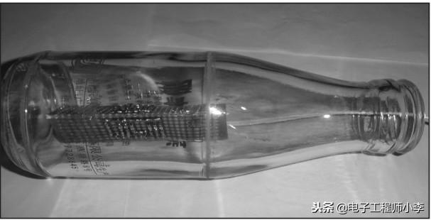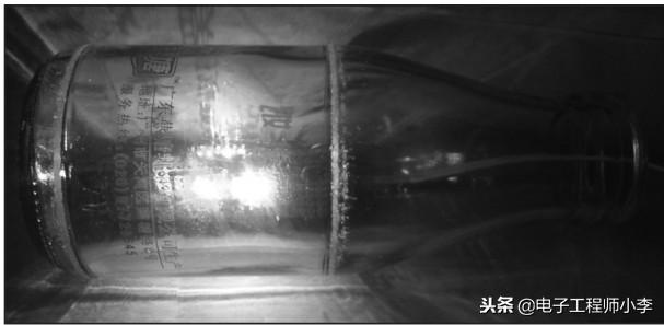 11 调试好程序后,就可以把它放进一个空玻璃瓶子里了,在底面板子的两端边上粘贴上双面胶,然后用镊子轻轻放进瓶子内部,在适合的位置上粘上去固定好,作品就可以宣布完成了,如图所示。电子爱好者也要加强环保意识,尽量利用废弃的物品来完成我们的电子制作,减少垃圾量,做到以废变新,这是一个不错的主意吧!而且LED灯发出的光在玻璃瓶的内壁折射又反射,显示出来的效果会比想象中要好多了!
