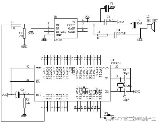 当按下开关SP1,AT89S51单片机产生“叮咚”声从P1.0端口输出到LM386,经过放大之后送入喇叭。