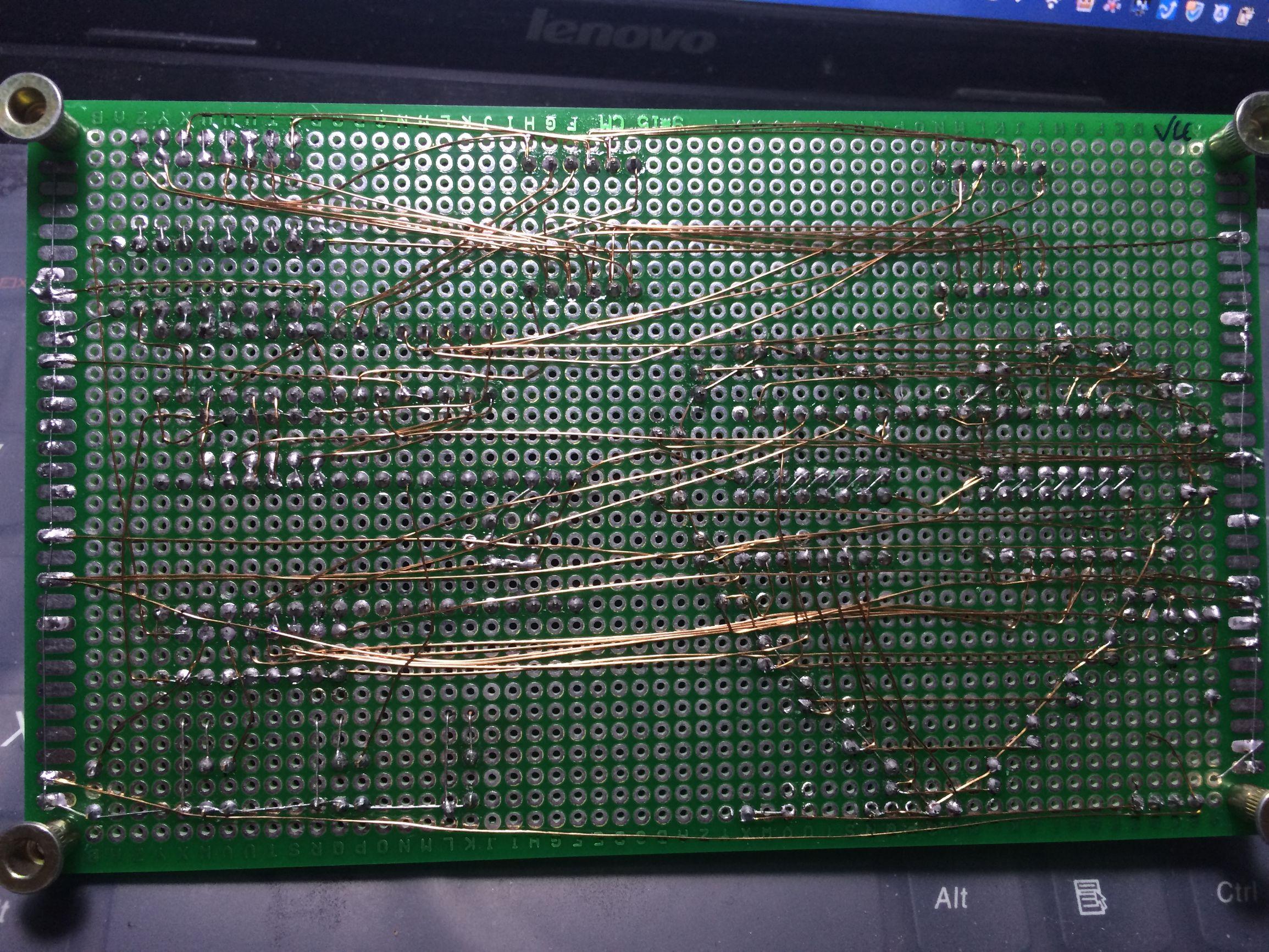 以下为电路板背面图,由于是洞洞板,用的漆包线连接,相貌丑陋,请不要计较: