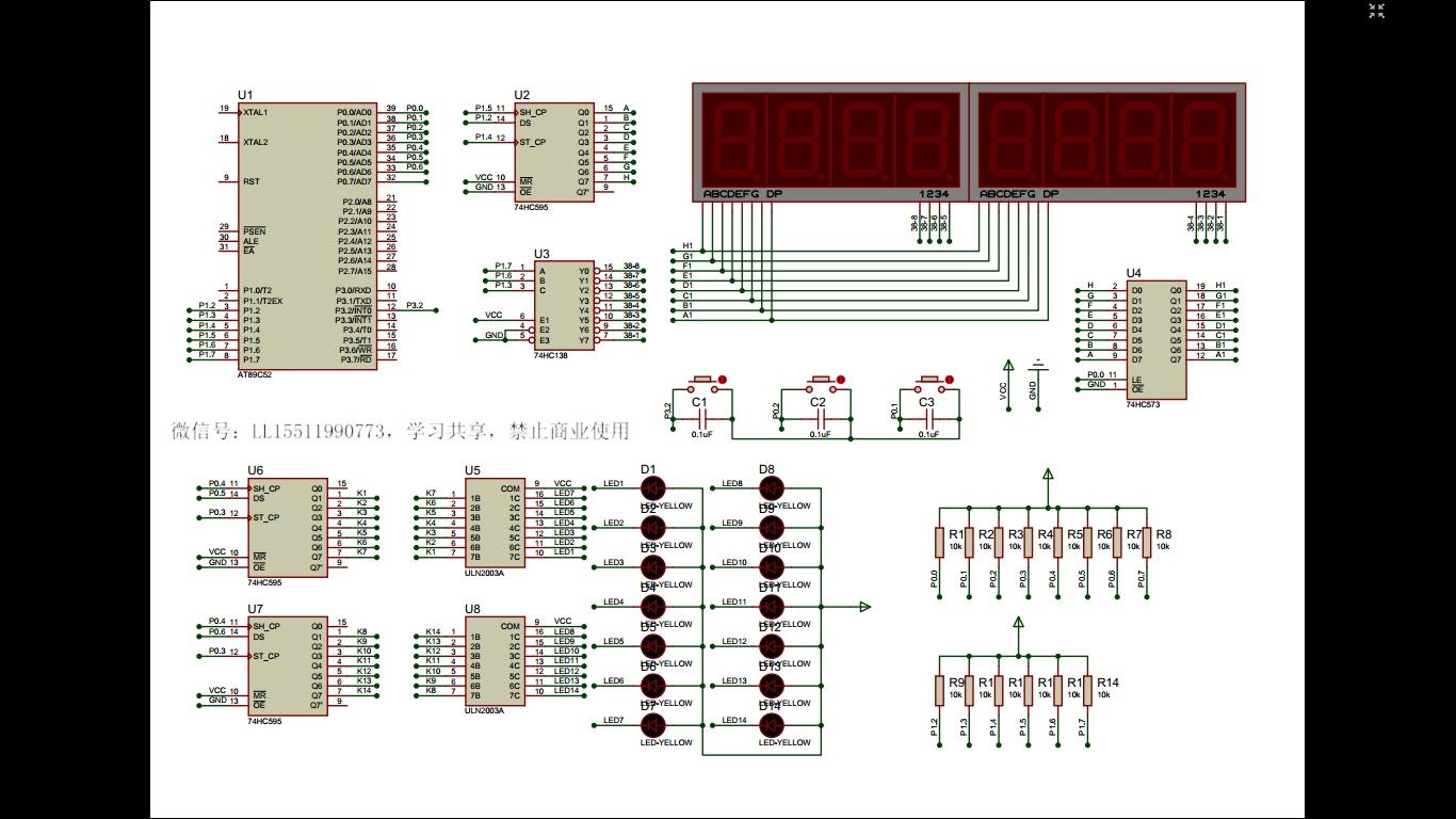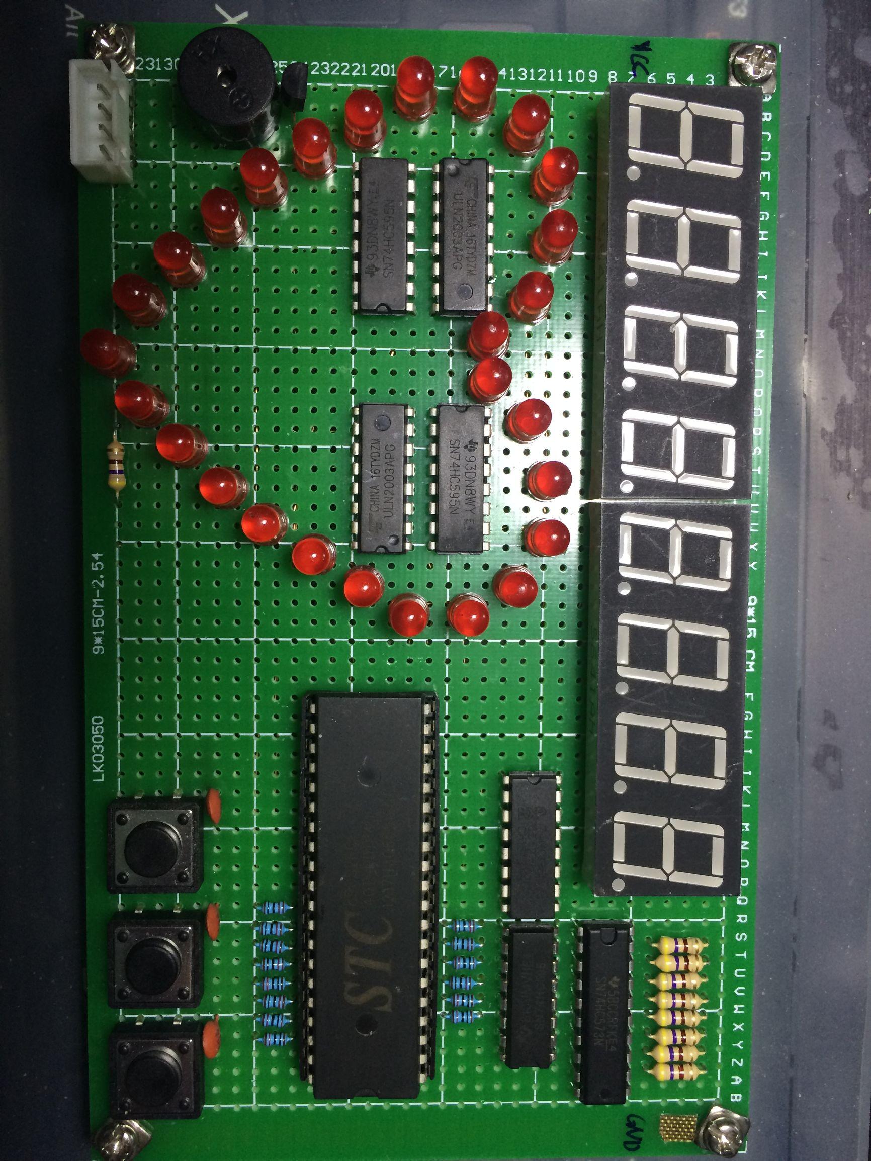 硬件:STC89C52RC一片(含基座),74HC595三片,74HC138一片,ULN2003A两片,74HC573一片,四位显示共阴极数码管两件,LED红色小灯27只,轻触按键三只,10K欧姆电阻14只,470欧姆电阻8只,104电容三只,外部晶振电路一组,另加电源接口(不含复位电路)