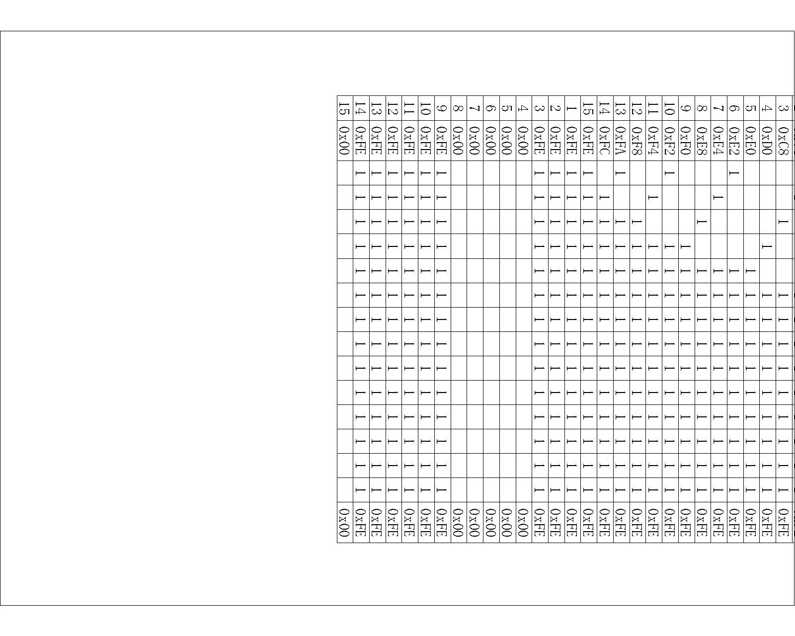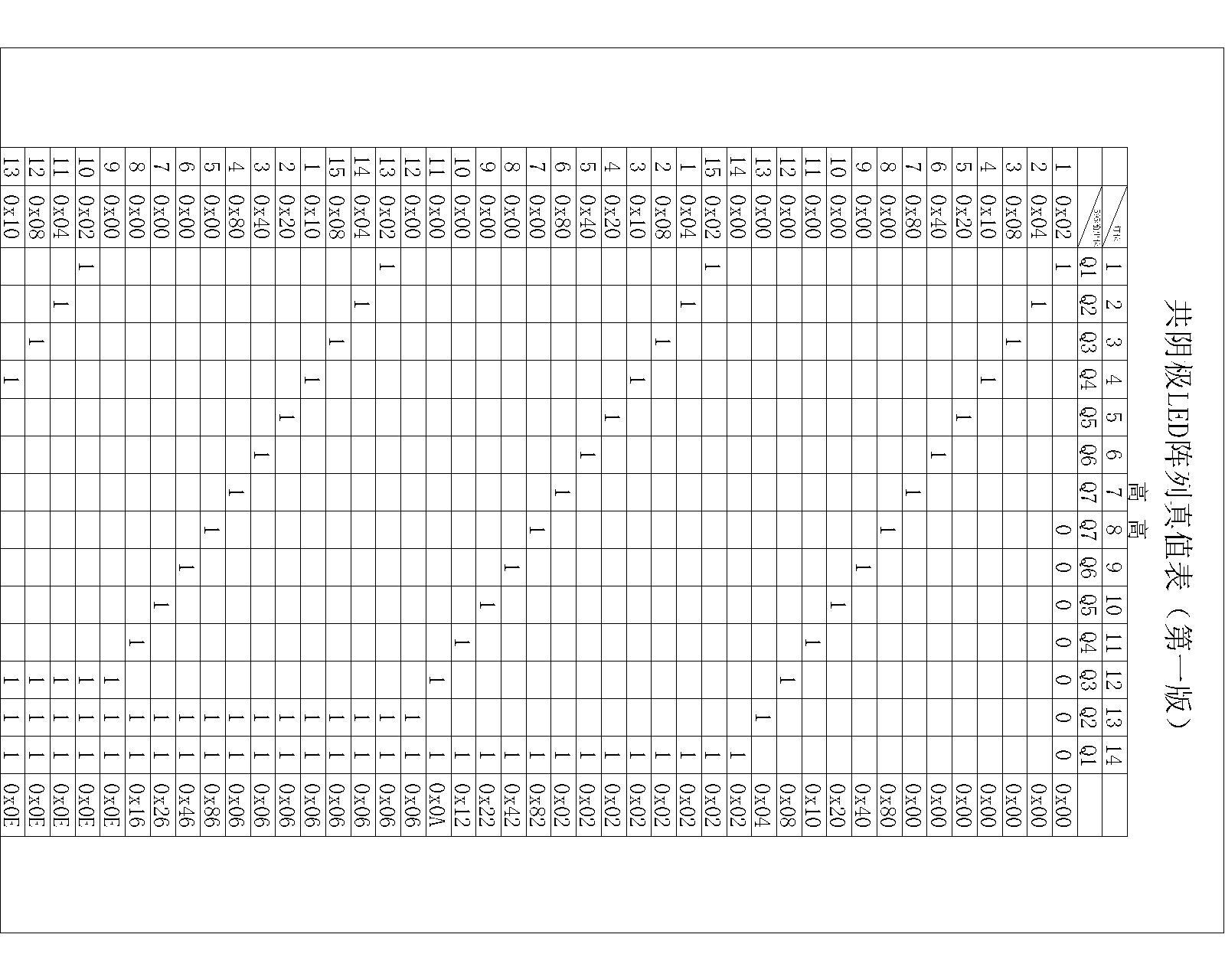 以下为LED小灯数据真值表,通过改变它,可以实现不同的显示效果(ULN2003A输入高电平,输出低电平信号,小灯共接高电平,但在编辑数据时,高电平小灯点亮,所以作共阴极处理即可):