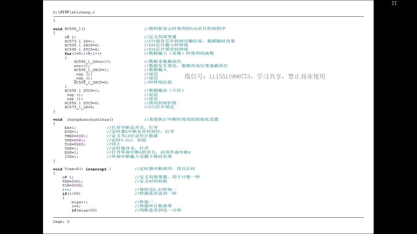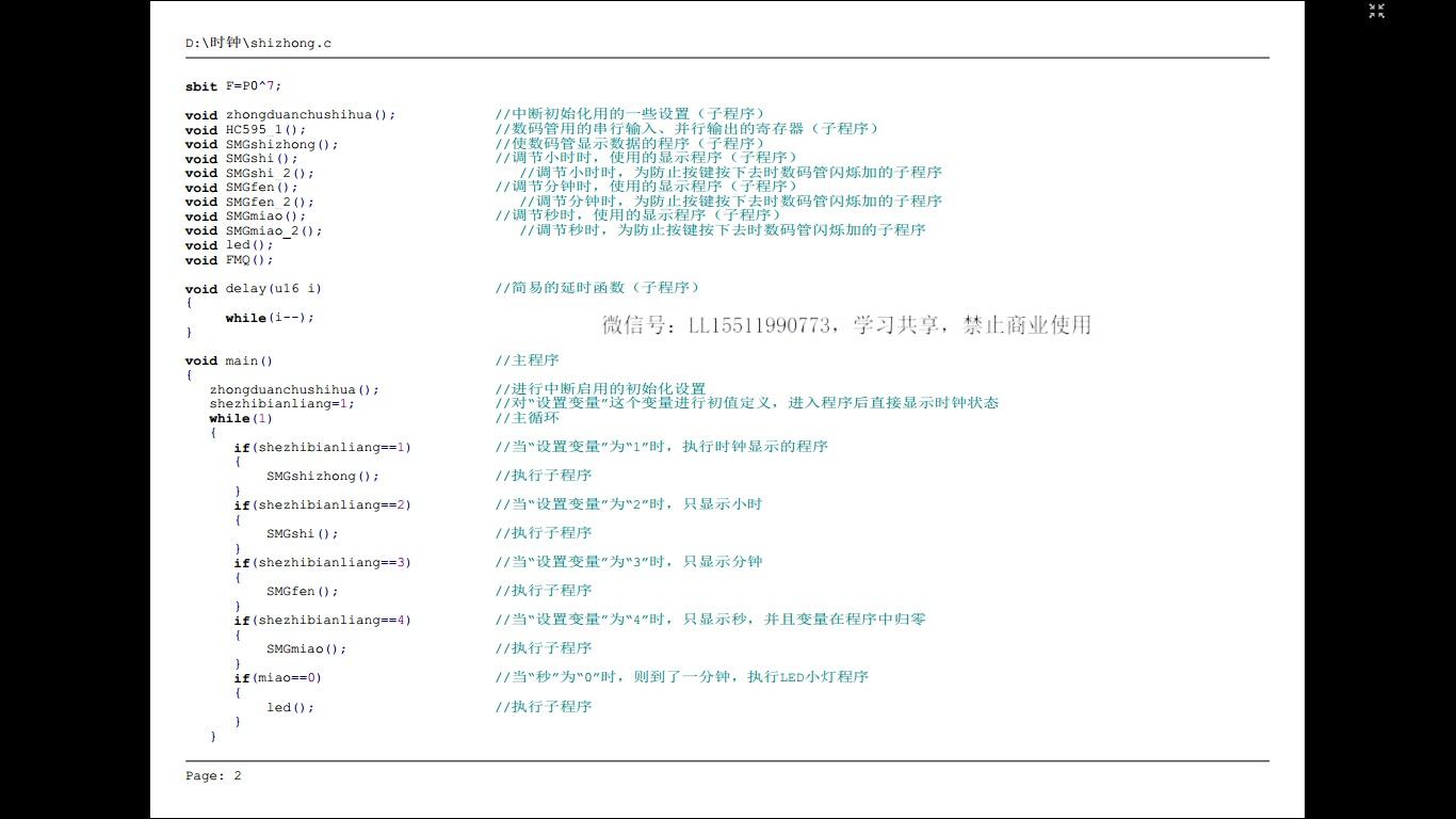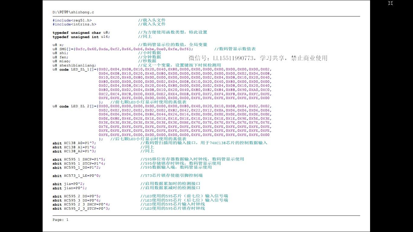 需要注意的是:一、启动设置时间的按键动用了外部中断引脚,当引脚为低电平时,立即响应中断程序,但轻触按键有抖动现象,虽加了电容,但实际效果并不好,这里主要用来熟悉外部中断命令的使用;二、未加复位电路,在自己制作的时候可以加上;三、74HC573芯片的使能引脚由单片机一个引脚控制,用于后期程序开发使用;四、图片中配有无源蜂鸣器,但本人模拟电路知识匮乏,未能实现“叮咚”响声的效果;五、本人是初学者,内部程序用的是最简单的语句,过于冗杂,请大家不吝赐教;六、经实验,时钟精度并不高,问题不知道出在哪里,很抱歉。