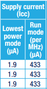 Supply Current:正常工作的电流指标。下图表示低功耗模式下待机电流仅为1.9uA;而运行状态下,每增加1M的主频,电流将增大433uA。