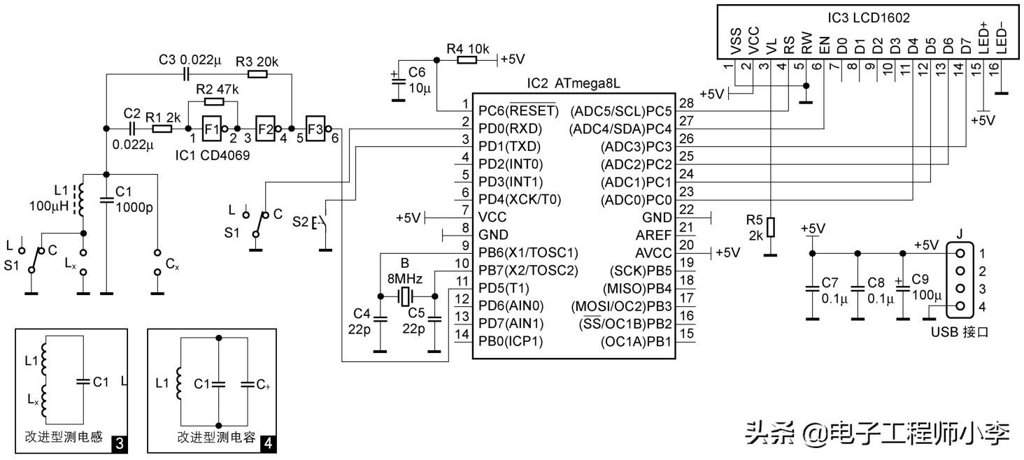 CD4069是6非门CMOS集成电路,其中非门F1、F2和C2、R1、R2等组成两级放大电路。第一级放大电路中,R2是负反馈偏置电阻,将F1输出端的直流电位钳制在VCC/2,使F1工作在线性放大区域。第二级放大电路没有加反馈电阻,直接用第一级放大电路输出的直流电压作偏置电压,以提高放大器的增益。放大电路通过正反馈回路R3、C3与L1、C1谐振电路一起组成正弦波振荡电路,非门F3用于信号整形,把F2输出的正弦波转换成矩形波输入到单片机ATmega8的T1脚,由单片机进行脉冲计数,从而测出LC回路的谐振频率。通过单片机对数据进行计算处理后,由LCD1602液晶屏显示测量结果。