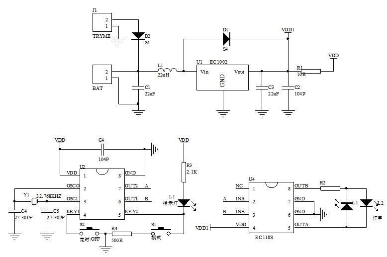 两个轻触开关输入控制,三路输出:2路主灯、1路指示灯。上电工作无定时对闪模式。