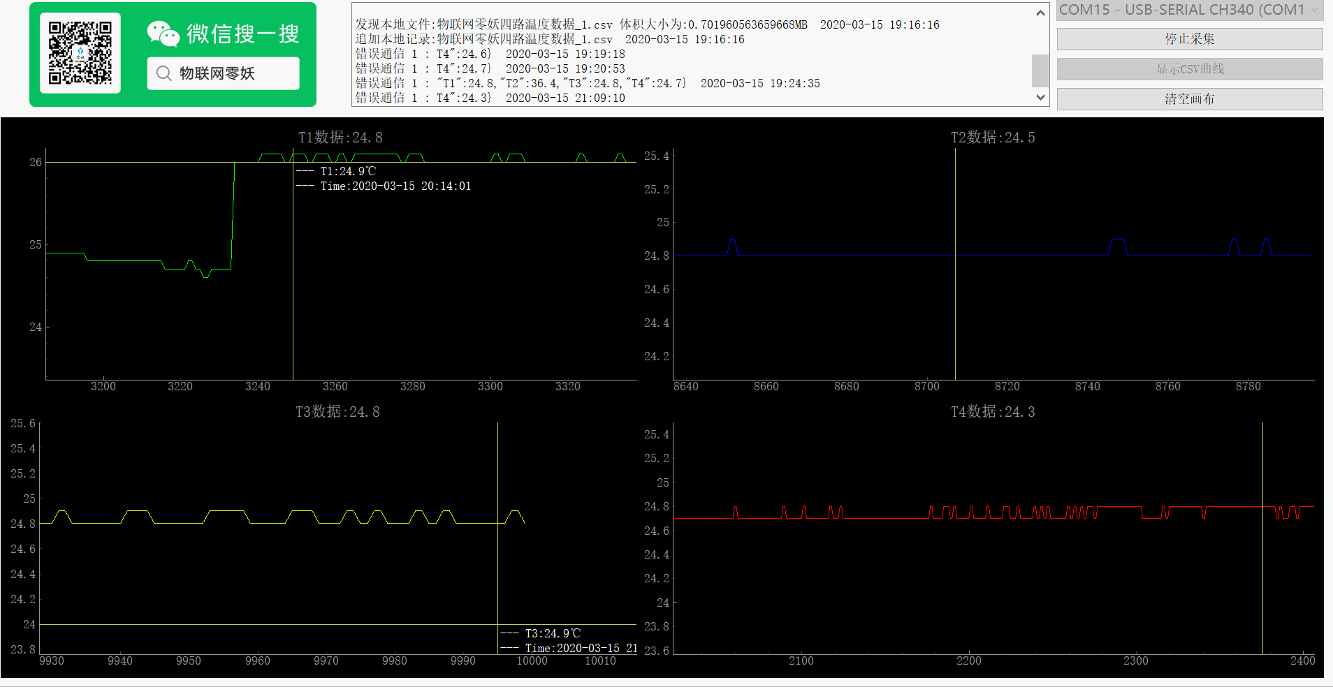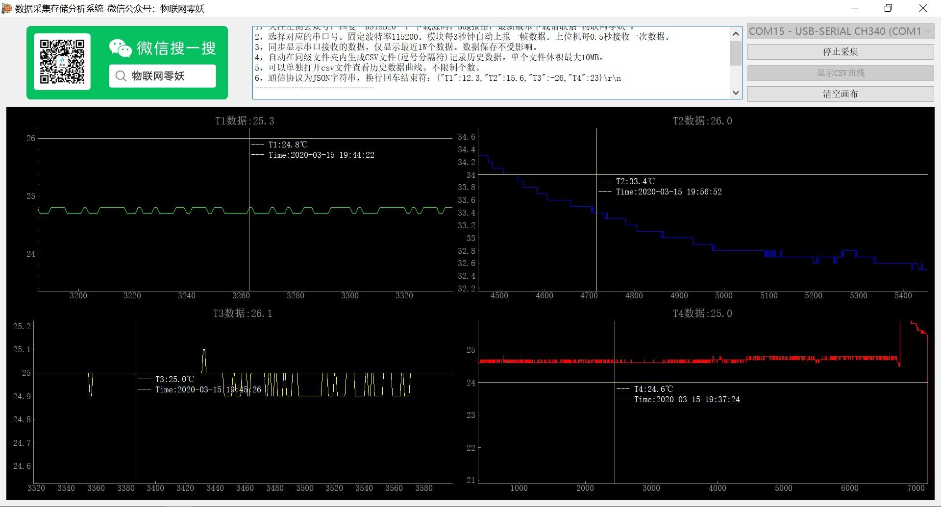 其实这种数据采集系统最核心的地方在于通信协议,一个合适的通信协议能避免后期80%以上的坑。这次设计的温度采集系统采用JSON字符串交换数据,一种人类和计算机都容易理解的字符串。固定3秒主动输出一次数据,嫌慢了你可以自己改源码。这样搞的好处是不用考虑太多的数据交互问题,安心做好数据处理就完事了。