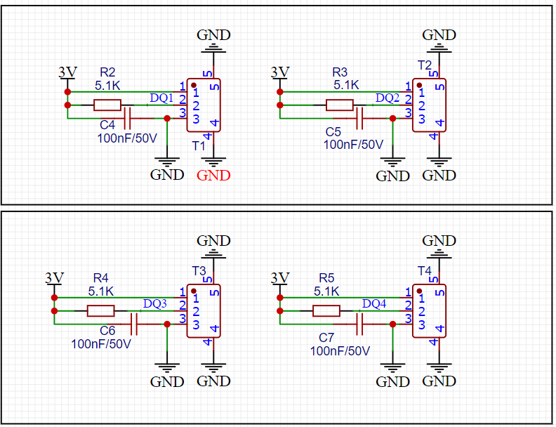 3,每个IO口挂载一个传感器,且独立供电。同时传感器的数据接口要通过电阻上拉到电源。