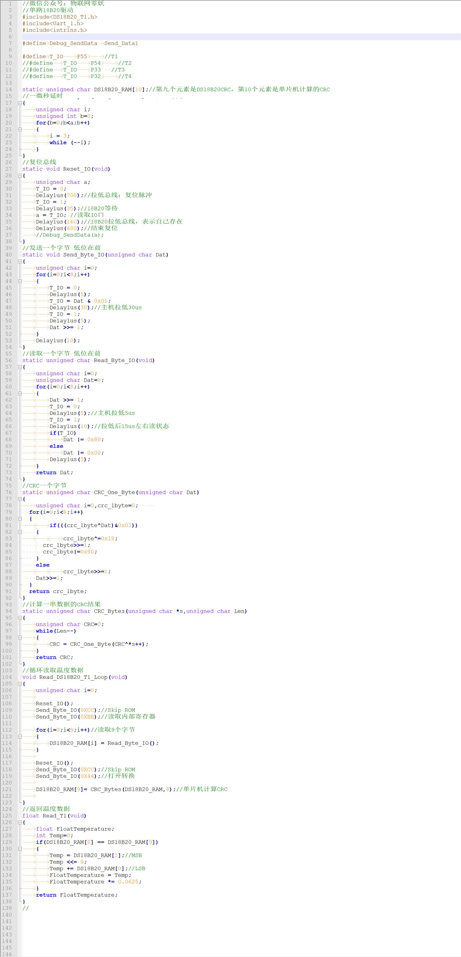 这里要作出说明的是,大多数DS18B20程序代码都是为12T单片机设计的,而1T单片机指令速度要比12T单片机快很多,这就导致了通常的DS18B20程序不能直接拿来调用。笔者根据STC的官方资料,通过计算指令外加逻辑分析仪测试的方式,得出的结论是,11系列的1T单片机指令要比12T单片机快6.5倍左右,根据这个数据来修改原始DS18B20程序的延时程序和EEPROM程序,就能保证系统的稳定性。