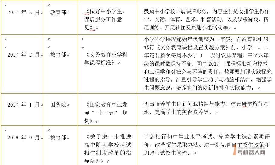 新时代人才需求背景下,应试教育转轨素质教育进程加速,政策改革决心已显:从2015年教育部《关于“十三五”期间全面深入推进教育信息化工作的指导意见(征求意见稿)》首次提及 STEAM 教育、创客教育等新教育模式开始,近年来,我国素质教育改革相关文件频频出台,改革行动速度明显加快。