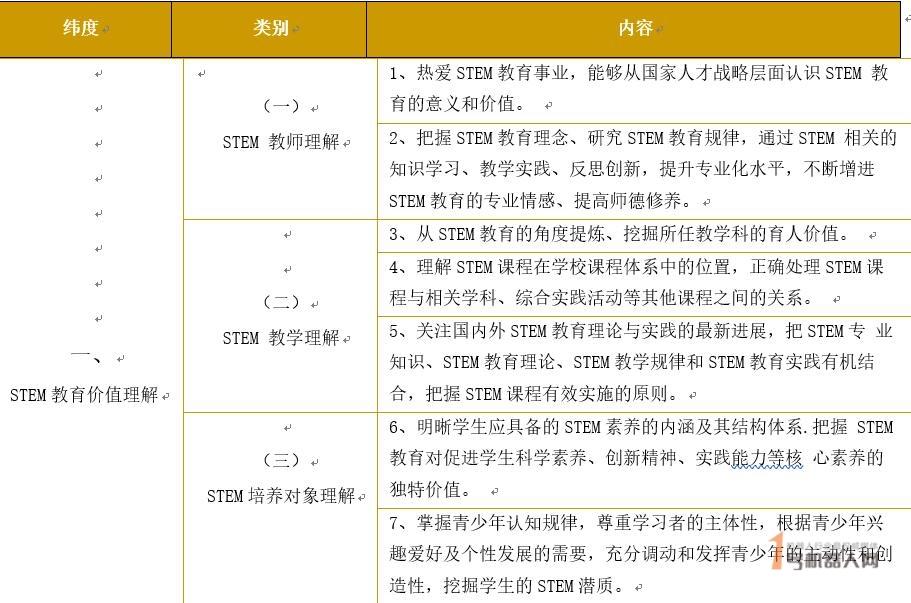 2018年5月8日,基于国际STEM教育发展经验,结合我国STEM教育发展现状做了拓展和延伸,中国教科院STEM教育研究中心发布了《STEM教师能力等级标准(试行)》,建立了STEM教师的权威标准与评估机制,有利于师资队伍整体水平的提高。《标准》的指标体系包含了5个纬度、14个类别、35条内容。