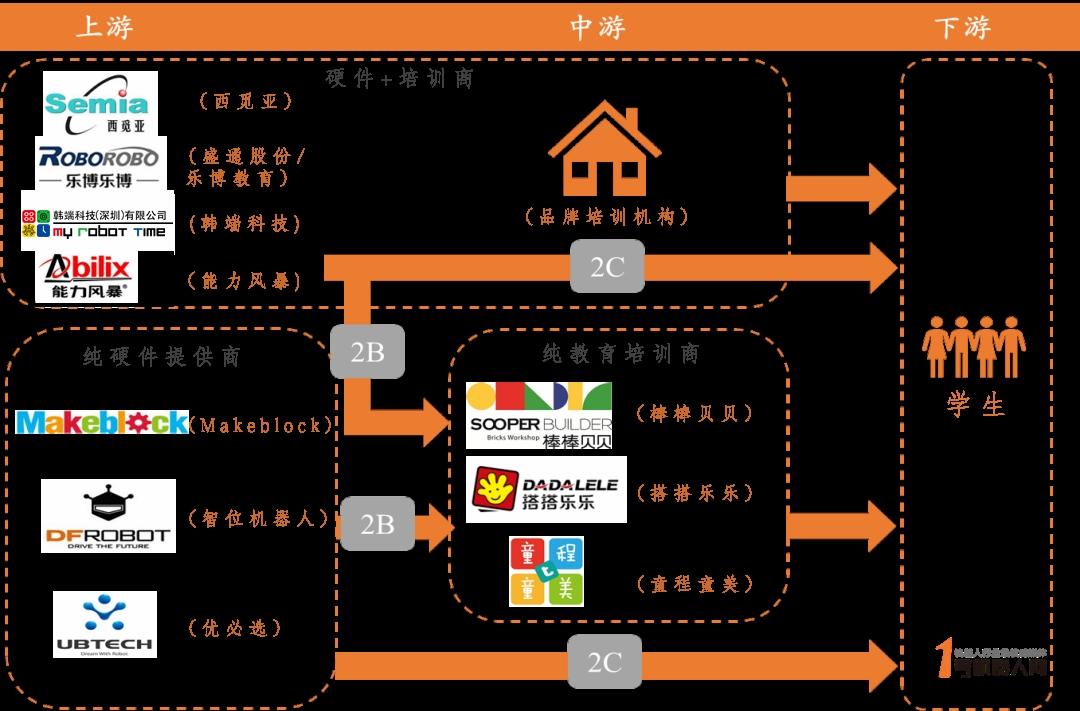 1)纯机器人硬件提供商主要经营2B2C端机器人教具销售。该类企业以硬件起家,达到一定体量后普遍向产业链中游教培业务延伸,转变成“硬件+培训”为一体的模式;如乐博乐博、韩端科技。 2)纯机器人教育培训商在硬件商处购买教具,自主研发或采用硬件提供商的培训课程体系,自主运营,以加盟或直营方式进行扩张。大部分的机器人培训机构都属于这种类型。3)兼营硬件和培训的企业既是硬件提供商,又开设了自己的培训机构,如西觅亚(乐高)等。