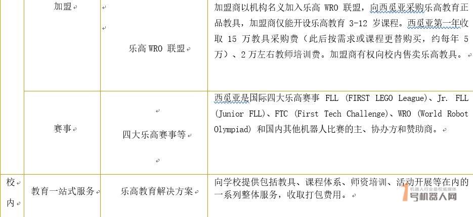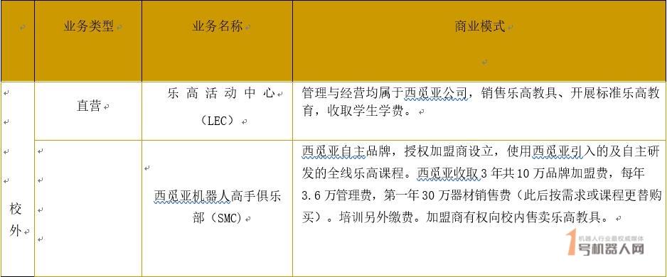 西觅亚多年来唯一代理丹麦乐高教育全系列教育产品在中国大陆和香港地区的销售。西觅亚代理乐高机器人教育初期主要销售渠道为学校采购,向学校提供较为完整的乐高教育教学解决方案,帮助学校建立机器人实验室、培训师资并开展机器人教育活动,培养学生参加国内外机器人竞赛的习惯。2010 年,西觅亚作为乐高教育在中国的代表,促成中国教育部与丹麦乐高教育的合作。该计划向全国400所中小学引入了乐高的教育器材、师资培训项目和创新教育理念。乐高机器人品牌成功在国内建立起影响力。