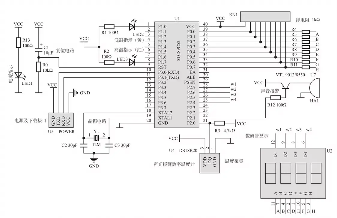 采用0.56英寸四位一体共阴红色数码管,实时显示环境温度。