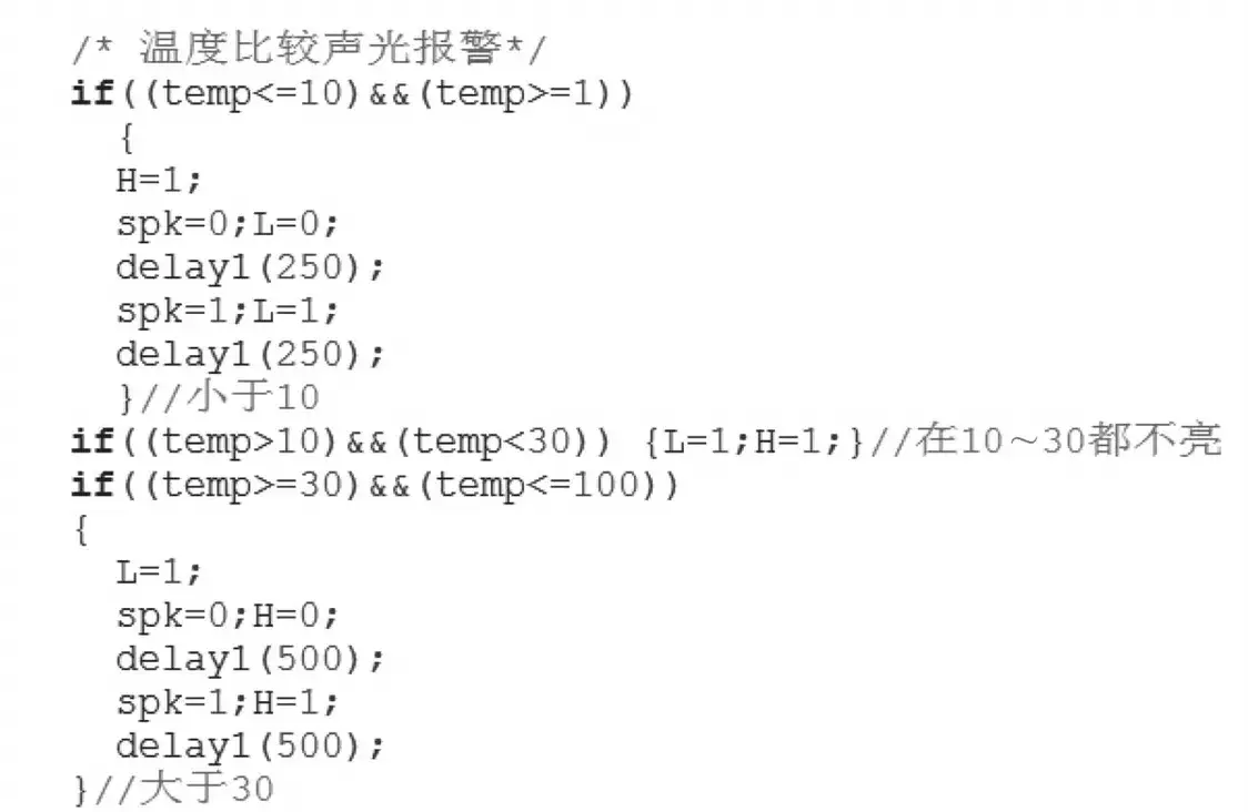 如果环境温度高于30℃,红色发光二极管点亮,同时蜂鸣器工作。