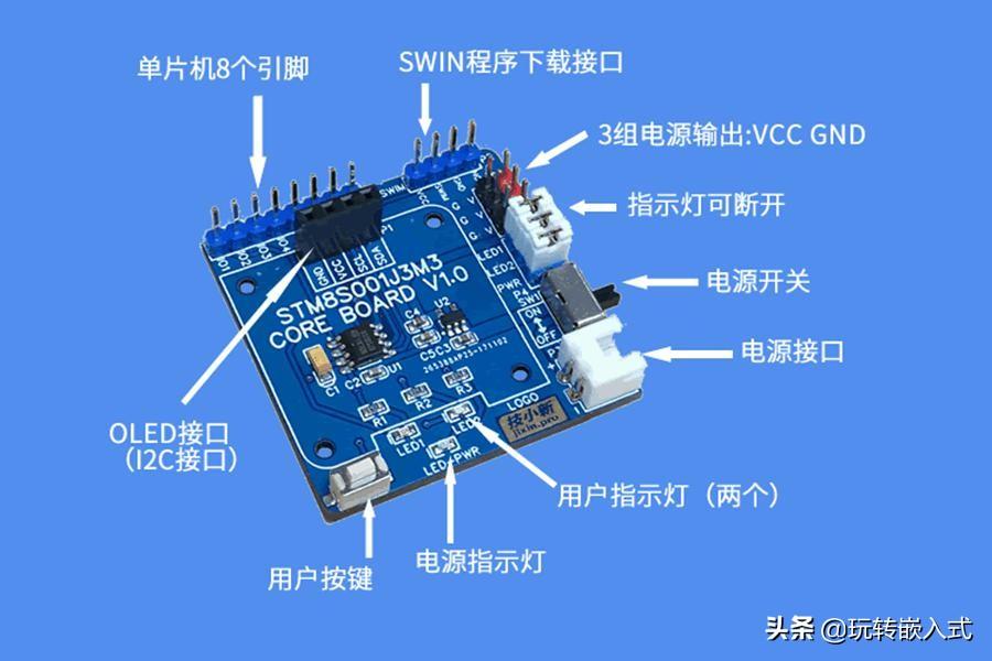 具有UART, SPI, I2C各一路,3通道10位ADC,具有5个可配置的外部中断,下载接口为SWIM方式。