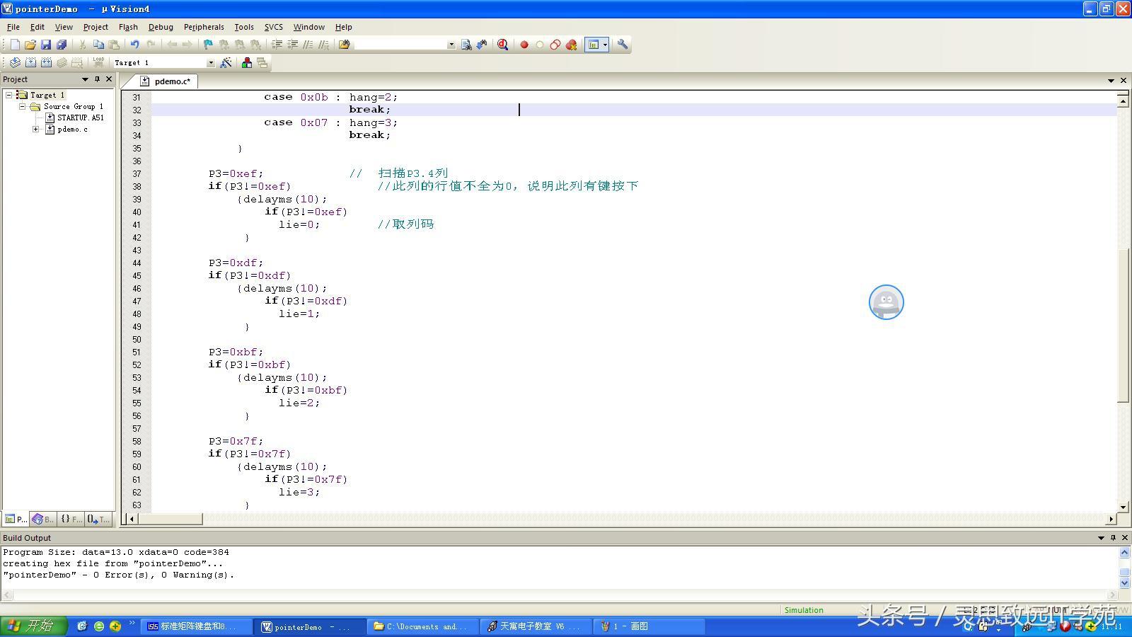 通过本实例,我们了解了如何用较少的按键实现矩阵键盘的按键识别。这为我们以后学习如何节约I/O端口打下了基础。