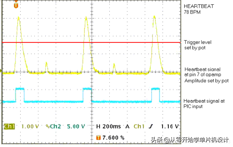 将示波器的表笔接到该运放的同相端,波形如图27.4所示。实际应用中杂波很多,脉搏容易被掩盖在其中。再将表笔接到运放输出端,波形如图27.5所示,高频杂波被完全抑制,经过R4和R5的反馈作用,脉搏信号被放大了500倍,达到2V左右,是不是很神奇?IC2C的重要性仅次于IC2B,该运放肩负着电压比较的作用。因为该运放没有反馈电路,所以当同相端电压大于反相端时,输出端将输出电源电压(9V);当同相端电压小于反相端,输出端会输出0V。整个电路调试的重点就是这里,通过调节R6,改变反相端的电压,将图27.5的波形调整成方波,输出如图27.6(黄色线为输入,蓝色线为输出)所示的波形。IC2D的作用就简单了,它只是将上一级的方波进行反相处理,因为单片机中断的方式为下降沿,需要在心脏起搏瞬间接受一个下降沿来计数(IC2D也可以省略,将IC2C的两个输入端反接即可)。