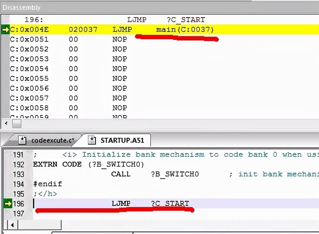 程序开始运行就在程序入口main函数的第一条语句之处,Disassembly窗口是c语言代码与汇编代码相对应的窗口,前面是地址,后面的是C语言对应的汇编语句。下面的窗口是相应文件的运行代码的位置,由黄色箭头指向当前正要执行的代码。然后点击单步运行工具条,直到跳出main函数为止,程序跳转到STARTUP.A51中的以下代码位置:
