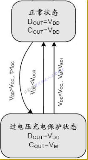 对电池进行充电,如果使VDD端电压升高超过过电压充电保护阈值VOC,且持续时间超过过电压充电保护延迟时间tOC,则DW01V将使充电控制端COUT由高电平转为VM端电平(低电平),从而使外接充电控制N-MOS管Q1关闭,充电回路被"切断",即DW01V进入过电压充电保护状态。
