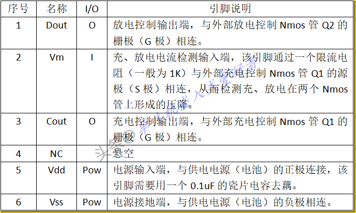 DW01V处于过电流放电/电池短路保护状态时,DOUT端将由高电平转为VSS端电平,从而使外接放电控制N-MOS管Q2关闭,放电回路被"切断" ;