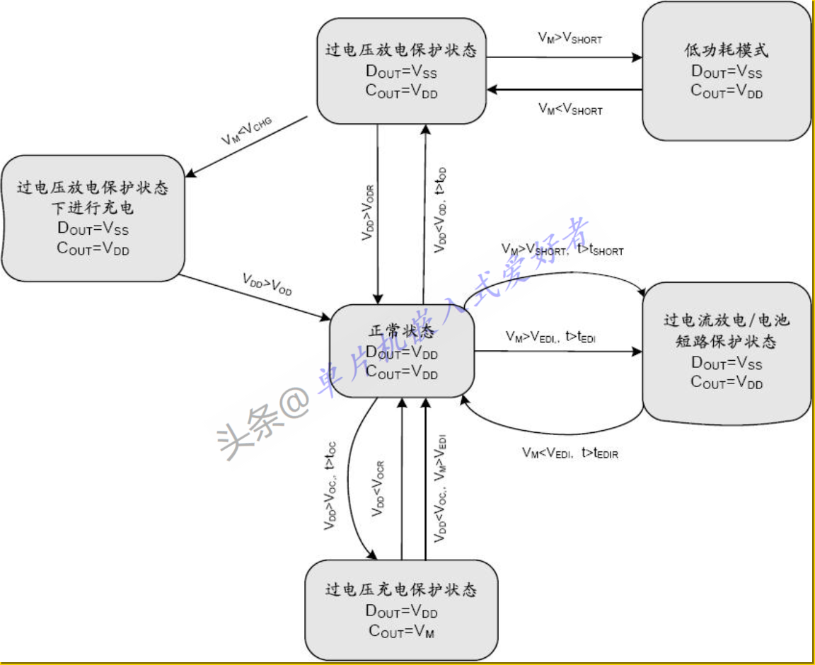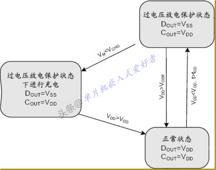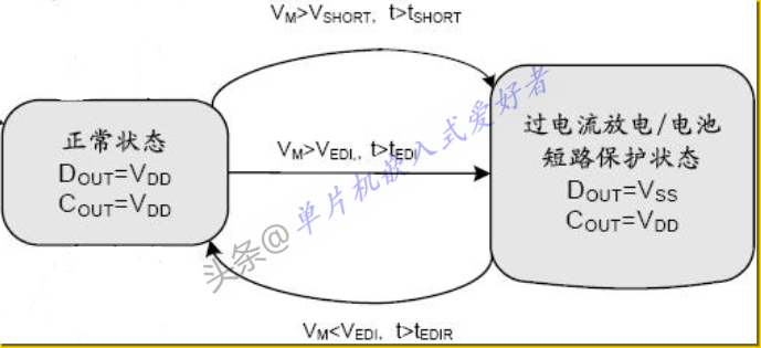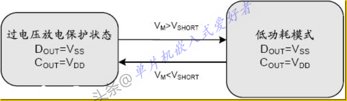 正常状态下,如果电池放电使VDD端电压降低至过电压放电保护阈值VOD,且持续时间超过过电压放电保护延迟时间tOD,则DW01V将使放电控制端DOUT由高电平转为VSS端电平(低电平),从而使外接放电控制N-MOS管Q2关闭,放电回路被"切断",即DW01V进入过电压放电保护状态。同时,VM端电压将通过内部电阻RVMD被上拉到VDD。在过电压放电保护状态下,VM端(亦即VDD端)电压总是高于电池短路保护阈值VSHORT,满足此条件后,电路会进入"省电"的低功耗模式。此时,VDD端的电流将低于0.7μA。