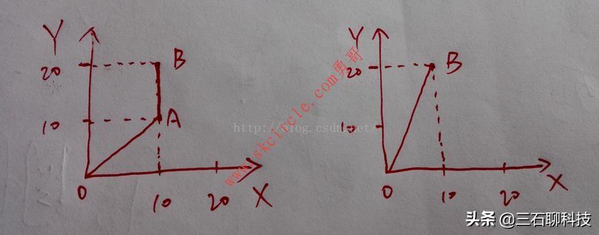 输入g00x10y20 和g01x10y20 1.如图一所示先运动到A点再运动到B点 2.如图二所示直接运动到B点