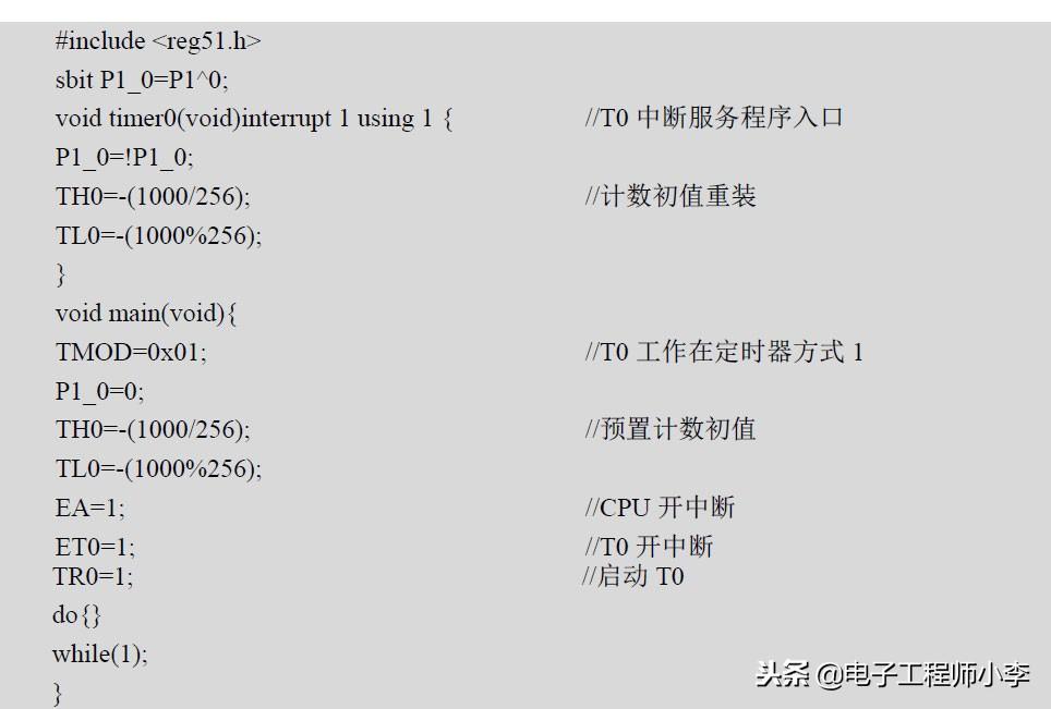 【例】 设单片机的fosc=12MHz,要求用T0的方式1编程,在P1.0脚输出周期为2ms的方波。