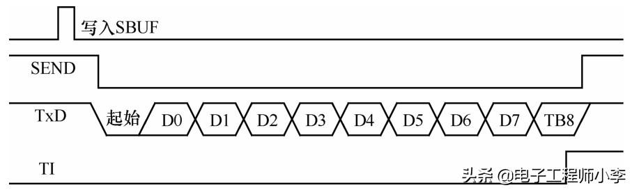 串行口以方式1发送时,数据由TxD端输出,CPU执行一条数据写入发送数据缓冲器SBUF的指令,数据字节写入SBUF后,就启动串行口发送器发送。发送完一帧信息的数据位后,发送中断标志置1,其时序如图2-24所示。