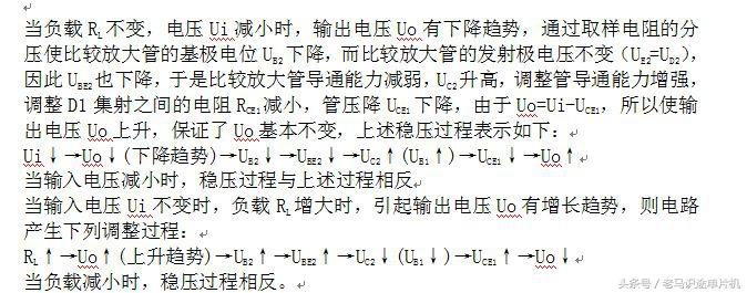 R3R4R5组成采样电路,当输出电阻将基础代谢变化量的一部分送到比较放大器的基极,基极电压能反映输出电压的变化,称为取样电压。电阻R2和稳压管D2组成基准电路,这Q2发射极提供一个基准电压,R2为限流电阻,保证D2有一个合适的工作电流。三极管Q2和R1构成比较放大环节,Q2是比较放大管,R1既是Q2的集电极电阻 ,又是Q1的基极偏置电阻,比较放大管的作用是先放大输出电压的变化量,然后加到调整管的基极,控制调整管工作,可以提高控制的灵敏度和输出电压的稳定性。Q1是调整管,它与负载串联,所以称之为串联型线性稳压电路。调整管Q1受比较放大管的控制,工作在放大状态,集射间相当于一个可变电阻,用来抵消输出电压的变化。