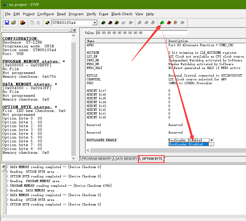 下载前用STVP工具软件读取芯片的选项字节,若发现没有使能BootLoader Enabled选项或者没有出现BOOTLOADER这一行,则该型号的芯片不支持串口下载。