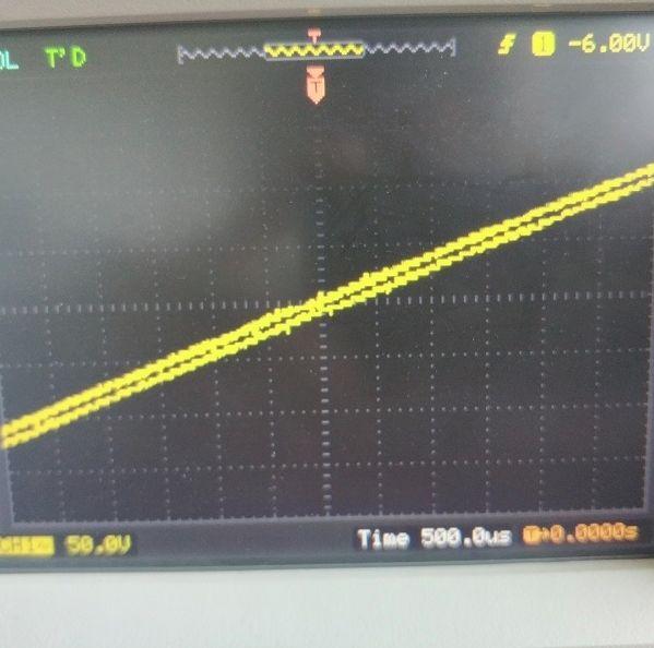 而目的是产生一个线性的模拟信号,因此当取样周期τ趋近于无穷小的时候,才可以达到理想状态,当然对于单片机来说(对于一个离散的数字系统而言)是不可能的,因此要尽量减少产生信号的周期;当然就算再减少,在示波器也可以看到阶梯状的信号~如图: