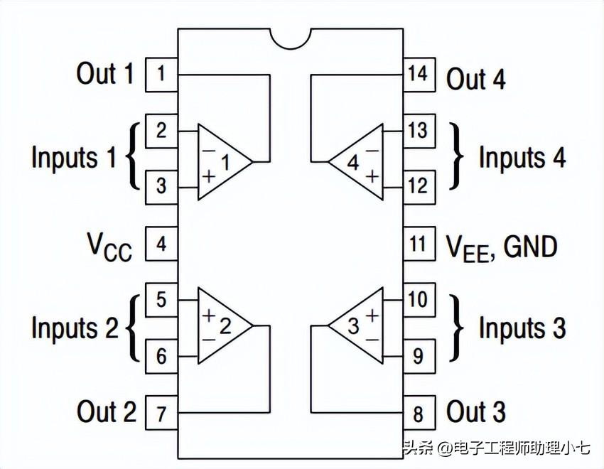 LM324 是一款低成本的四路运算放大器 。由 4 个高增益放大器组成,4 个运算放大器可由单一电压源供电。