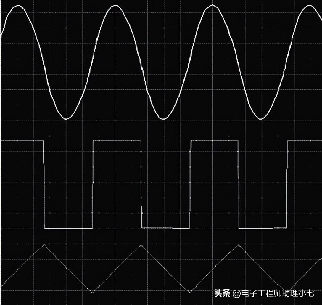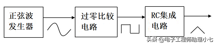 波形生成和转换的方案有很多种,这里采用的是下图所示的:正弦波-方波-三角波 。