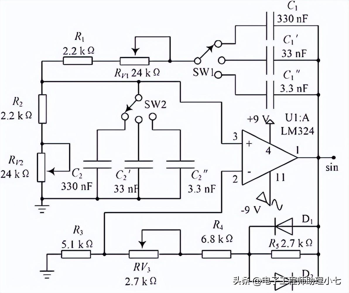 正弦波产生电路不仅要产生所需的正弦信号,还要产生后续电路的输入信号。这部分电路采用典型的 RC 桥式正弦波振荡电路 。