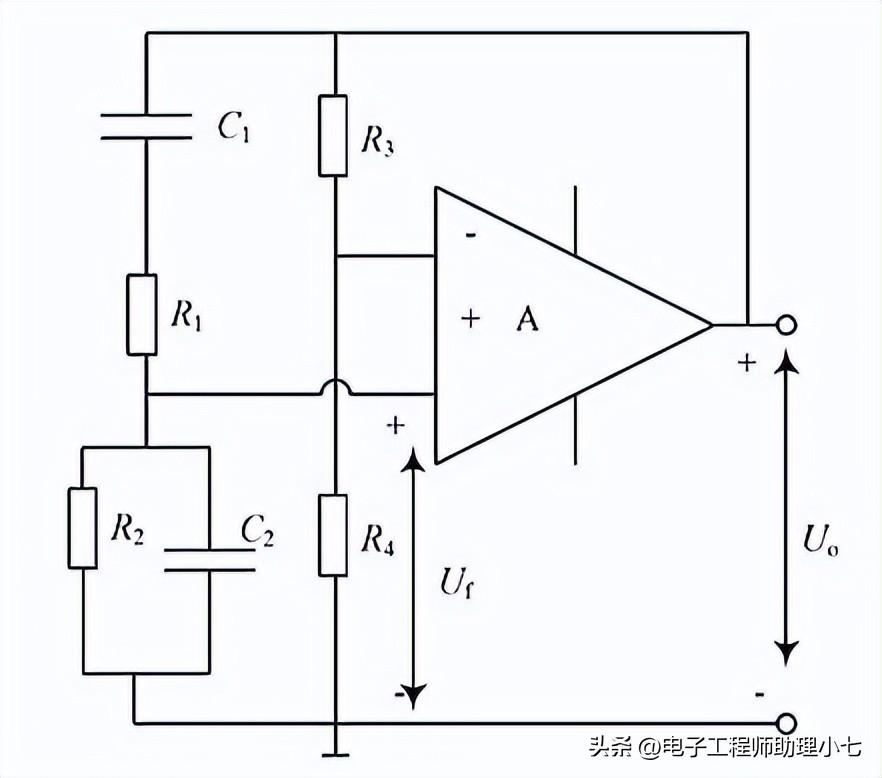 如下电阻 R1 与电容 C1 串联,电阻 R2 与电容 C2 并联组成的网络为 RC 串并联选频网络。选频网络也是一个正反馈电路,提供零相移,构成同相放大器。