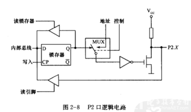 当将P2端口用作输出端口时,给锁存器的CL端送写脉冲信号,内部总线上的数据就被锁存进锁存器并从Q端输出,再通过电子开关、非门和场效应管从P2端口引脚输出。