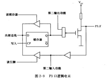 P3端口8个引脚的第二功能详见表2-1。例如P3.2引脚用作第二功能时,该端口可输入由外部设备送到的中断请求信号,该信号通过缓冲器、输入三态门送到内部总线。