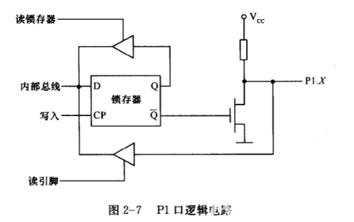 从图2-7中可以看出,P1端口的结构较P0端口简单很多,由于P1端口内部采用了一只场效应管,并且与电源之间接了一只上拉电阻,所以不需要在P1端口的外部接上拉电阻。