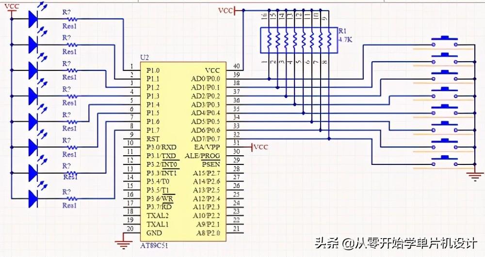 上述功能是用最基础的编程方法实现的,聪明的你想一想还有其他办法实现吗?通过以上代码,我用PROTEUS仿真图如下:结果8个按键可以分别控制8个LED,实验成功!