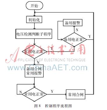 软件设计部分包括显示程序与控制程序。显示程序用来显示检测到的实时电压值,供人工查询;控制程序用来实现单片机对继电器与电机的控制,完成常用、备用电源之间的转换。图8为控制程序流程图。软件程序采用C语言及其内部特定的内核函数编写,提高了程序运行效率;采用“指令冗余”技术,多编写单字节指令,在双字节、三字节指令后面加两条单字节指令NOP,增强了控制器软件抗干扰能力[7]。