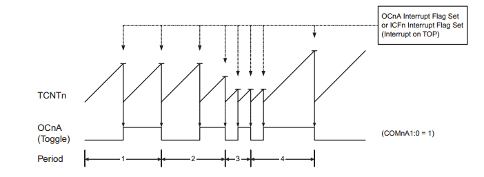 当计数器TCNT1达到预先设定的OCR1A或者ICR1的时候,TCNT1被自动的清0,OCR1A或ICR1定义了计数器的最大计数值。