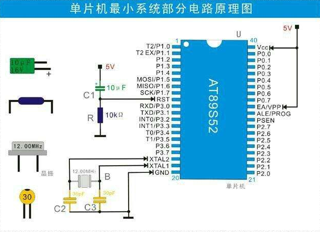 晶振电路:典型的晶振取11.0592MHz(因为可以准确地得到9600波特率和19200波特率,用于有串口通讯的场合)/12MHz(产生精确的uS级时歇,方便定时操作)
